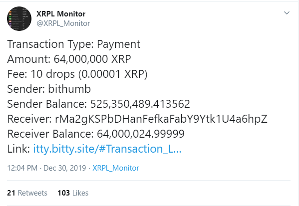 Bithumb crypto exchange has exited over 188 million XRP in total in the month of Jan. According to the XRPL Monitor Twitter account, an amount of 64000000 was sent from Bithumb to the unknown wallet on 30th Dec 2019.