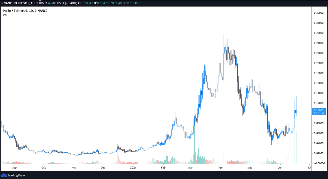 Despite this recent decline in the entire crypto market, one coin (Perlin, PERL) has managed not to experience the dip. Instead, PERL rose from about $0.053 to about $0.135 between June 8 and 18, 2021, a remarkable 150% increase in price. Also, its average 24-hour trading volume rose sharply from $3.5M to approximately $123M.