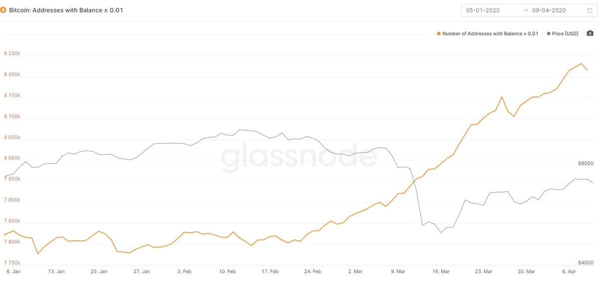 The crypto data analytics firm Glassnode published a graph showing at which rate BTC addresses, having more than 0.01 BTC, increased.