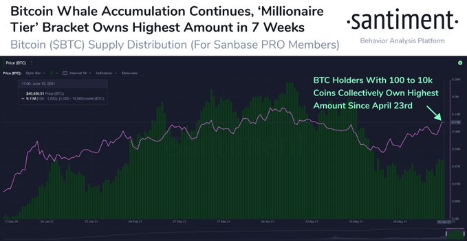 Santiment tweeted the update on its official Twitter page with a link provided to the actual report. These whale wallets holding 100-1000 BTC have now accumulated a total of 9.11m BTC summing up to $366.89 Billion and also 48.7% of the cumulative supply of Bitcoin. Total supply of Bitcoin is 21 million and miners have only mined a little over 18 million. The 90,000 BTC acquired over the past three months by the whales also sums up to a whopping total of $3,606,867,900.