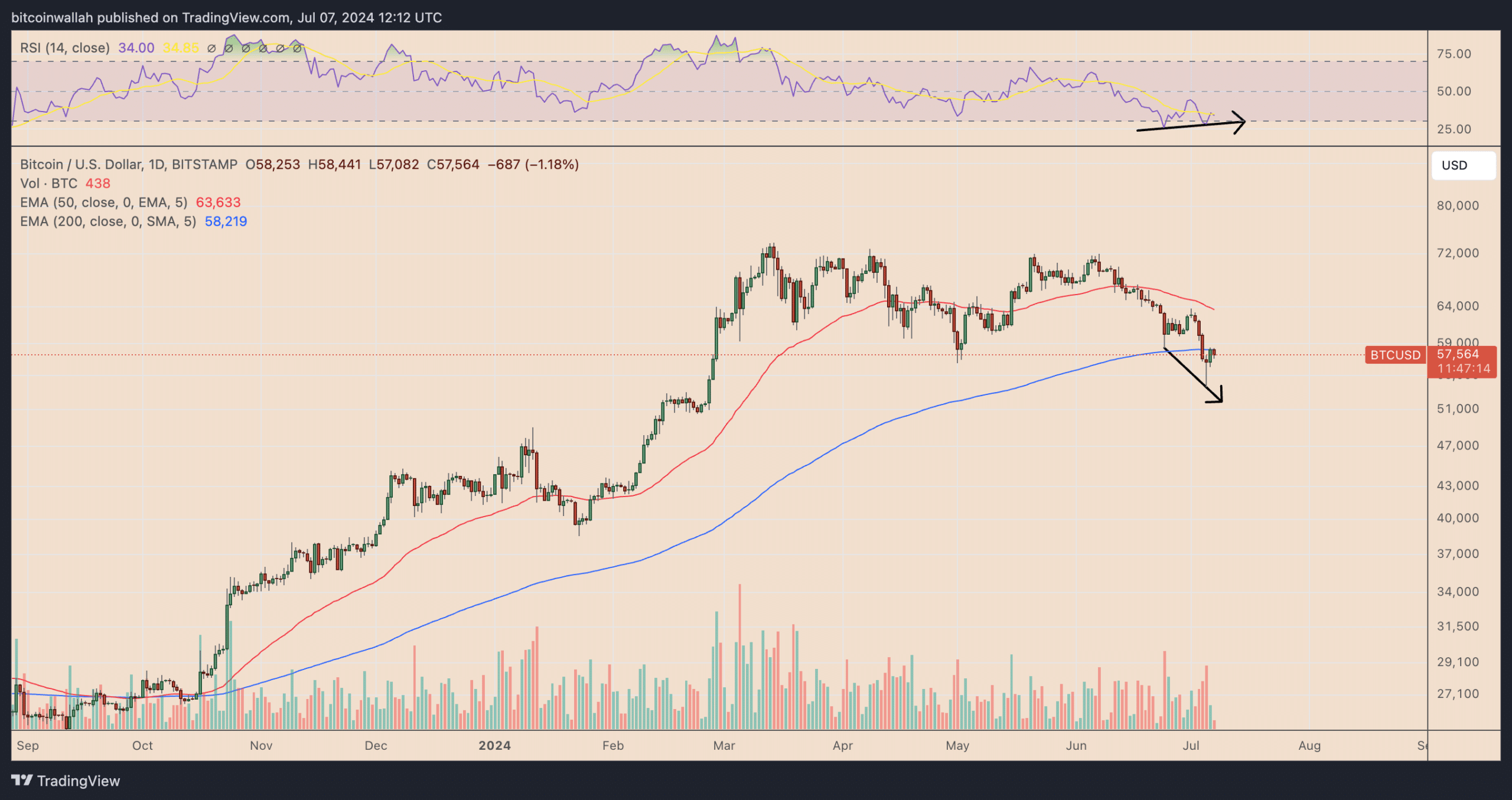 The recent Bitcoin price drop was accompanied by an increasing divergence between dropping prices and the rising relative strength index (RSI). The divergence shows that the selling pressure is slowly weakening, although the price keeps dropping.