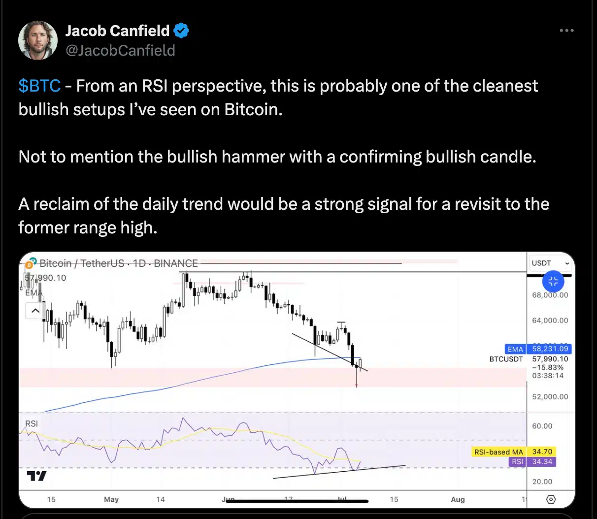 Two other classic technical indicators support the bullish reversal scenario. First, Bitcoin formed a bullish hammer candlestick pattern on July 5, featuring a small body at the upper end of the daily candle, with a long lower shadow and little upper shadow. A similar situation happened in May.