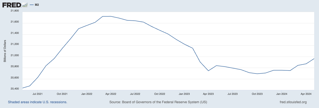 As of May 2024, the M2 money supply increased by around 0.82% year-over-year, reducing its aggregate drop from the peak drop of 4.74% in October 2023 to nearly 3.50%.