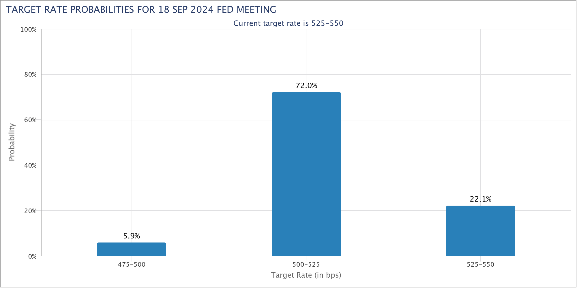As of July 7, Wall Street traders saw a 72% potential of the United States Federal Reserve cutting interest rates by 25 basis points, according to data collected by CME. A month ago, the potential of the same was 46.60%.