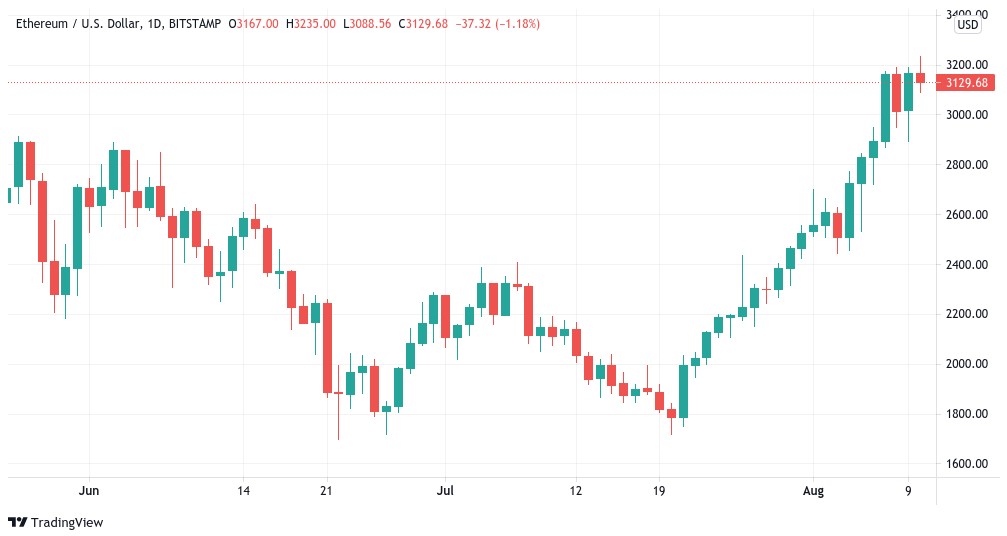 ETH has gained 26% in the last week, and after reaching $3,250, it has cooled off a little and now trades at around $3,120. As widely reported, this week is the first time for over two months that the entire crypto market cap will be close to $2 trillion.