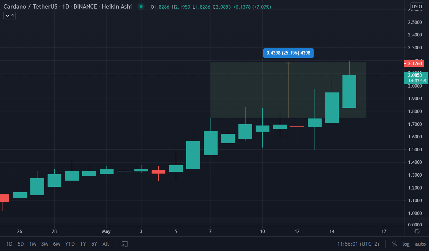 Having gained about 30% this past week and 16% since yesterday, the cryptocurrency currently fluctuates around the $2 mark. Its market cap currently stands at $68 billion. This cryptocurrency is about to topple the meme-inspired coin (DOGE). Since the start of this year, has given almost 1250% returns or about 13.5x returns year-to-date.