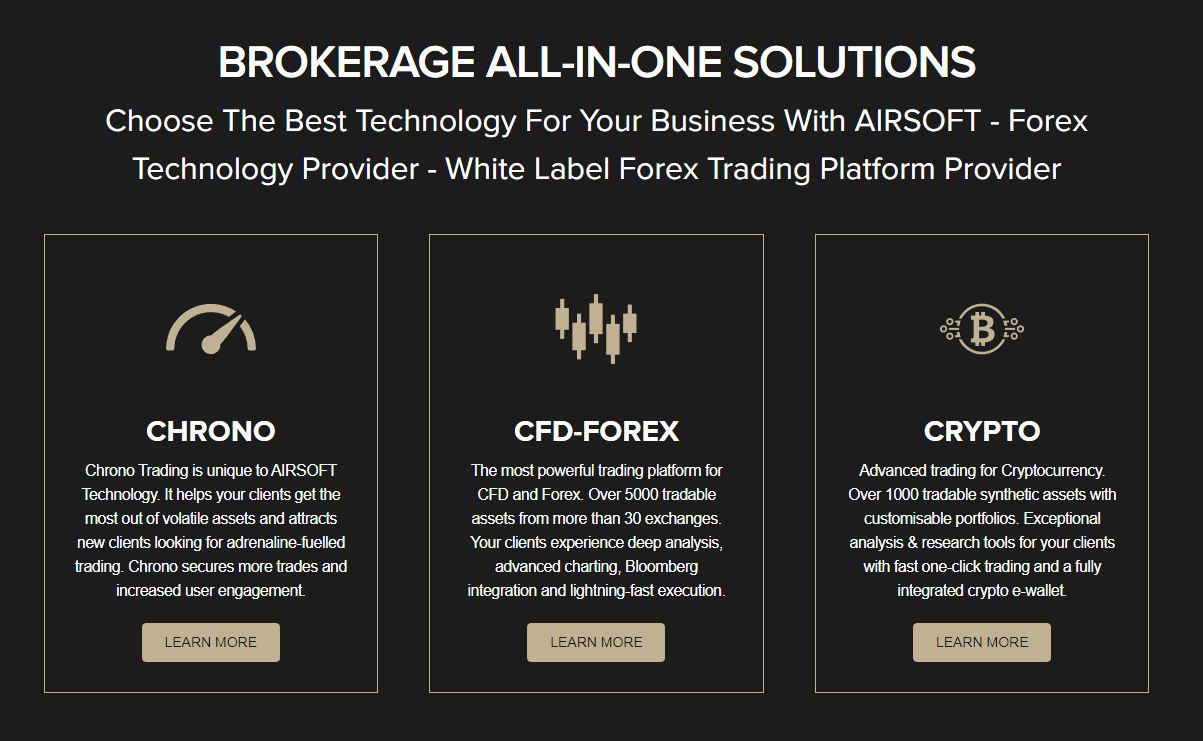 AIRSOFT lets you offer all of that to your traders. They can trade forex currency pairs in the CFD format. Furthermore, you can open doors for your traders to invest in the cryptocurrency market.