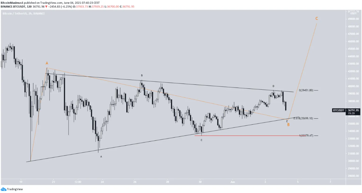 Notwithstanding, the bullish trend will likely be maintained. When you consider the triangle as a whole, it is similar in structure to be b section of the a-b-c corrective wave. Hence, it is likely that the price would be on an uptrend even if it drops to or close to the support line. But if the price should decline below the C-wave at about $33,400, it will nullify the established pattern. The above scenario is much less likely as a bounce close to the support at $35,800 is more feasible. Based on the wave count, the direction of the future trend will depend on whether BTC reaches $33,400 or $40,910 first.