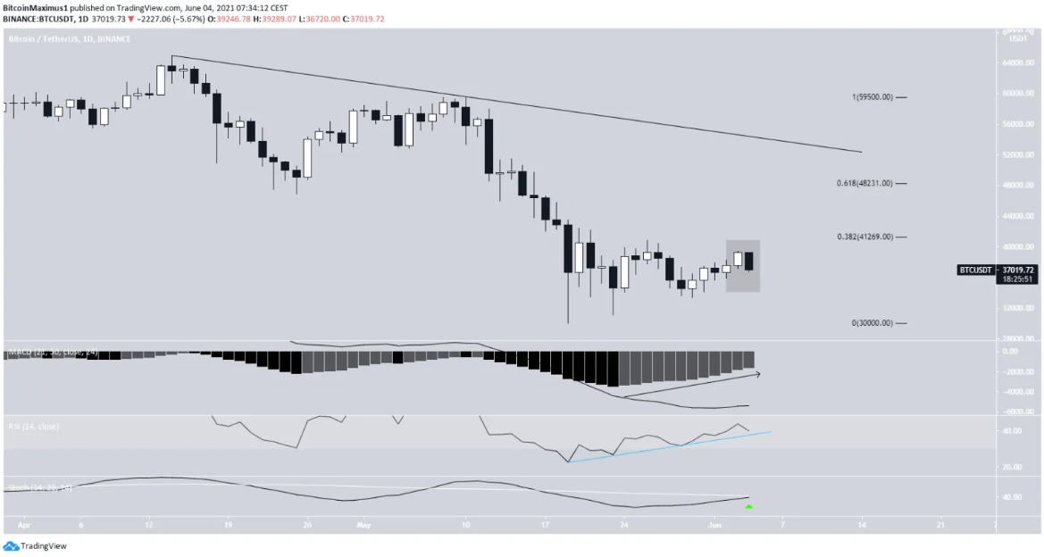 After declining to a local low last month, bitcoin kept trading within a symmetrical triangle. However, it surges above the triangle to reach about $39,500, but the rise was short-lived. It is now back within that triangle, following a gradual fall since that time. (see the red part in the image below). Even though the critical points (MACD and RSI) are still bullish, they might turn bearish soon unless there is a price rally.