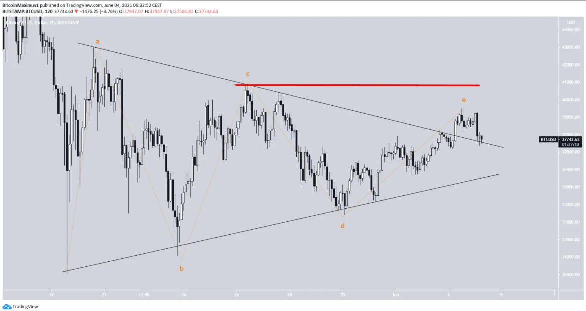 Even though it seems unlikely, the bearish trend is still a possibility. That is because there is no vertical movement over the $40,910 high of the possible c wave (red line below). The wave isn’t defined probably because the E wave is at its longest, considering its time for this E wave to occur. But, it can still be considered a 4th wave triangle so long the high isn’t wiped off.
