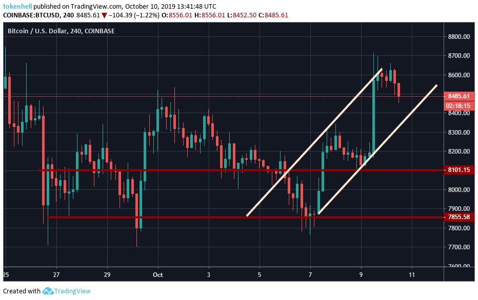 As you can see in the below chart, the value according to the 4-hours chart is moving in an upward direction. But at the apex, there are red candles representing some bumps in the road towards the upward direction. The support level at $7.885 proved to be a strong bouncer and hit the trend line upward. There was strong resistance at $8,100 but it was overpowered by the great momentum of BTC. But the resistance level at $8,600 acted as a hard wall and tried to pull back the trend line.
