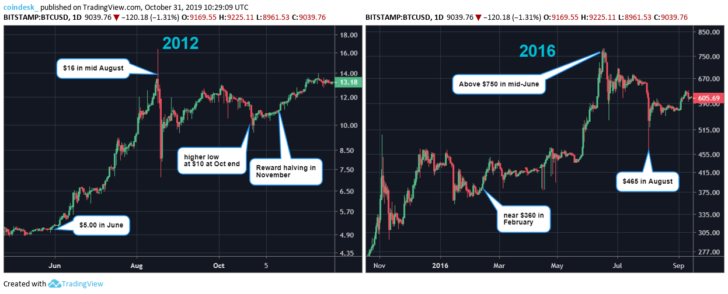 While in 2016, the price showed a price rally moving from $360 to $780 before the bitcoin halving event. The bitcoin mining reward was further cut down from 25 BTC to 12.5 BTC in the 2016 halving event.