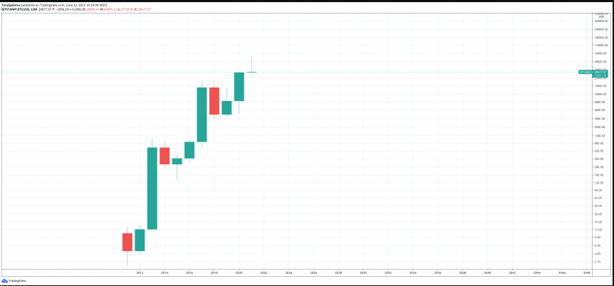 The Doji on the 12-month BTC/USD chart. Source: TradingView