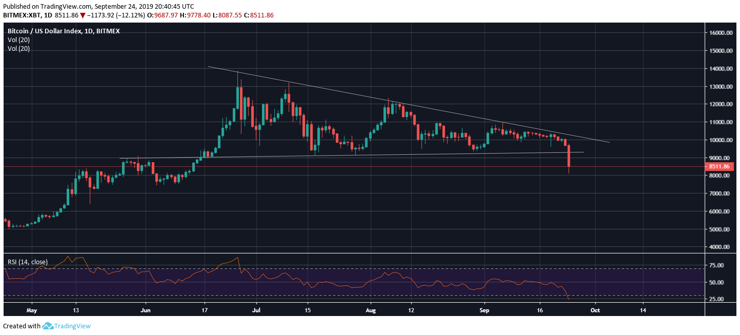Bitcoin has shown a downtrend of around 13% from which 1000$ was just removed from the price in just 1 hour.The current price of bitcoin is $8,512.39 as on 25 September 2019 at 6:58 amUTC.