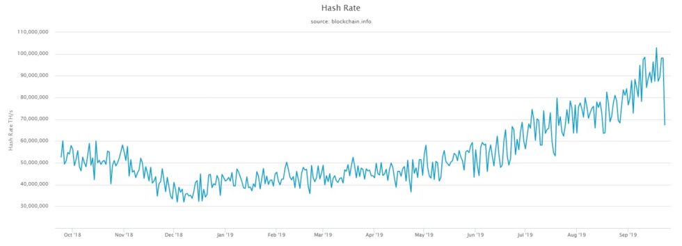 According to Blockchain.com hash rate of bitcoin crash down to 40% on 23 sep 2019.this might be the possible reason of bitcoin price crash.