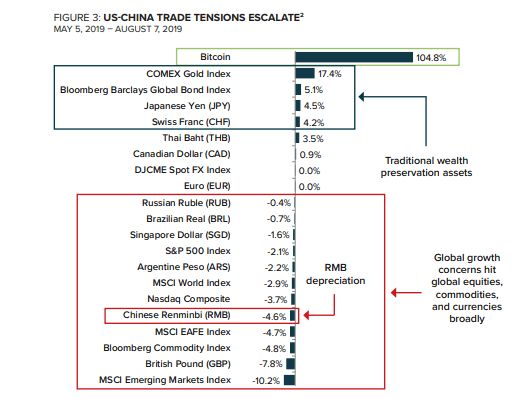 Since Donald Trump announced to put additional taxes on the Chinese goods, the growth of 20 assets given below in the chart has declined up to 0.5 % but on the other hand, the cumulative return of Bitcoin has reached to 104.8%.
