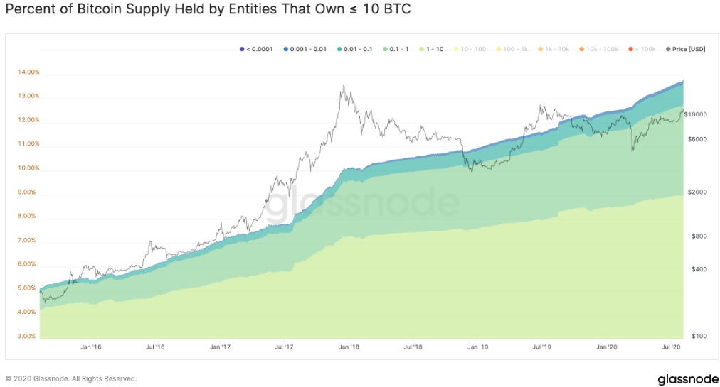 Cryptocurrency data provider Glassnode shares a graph and claims that the supply of Bitcoin is moving towards entities having BTC holdings in a low amount. Glassnode explained: