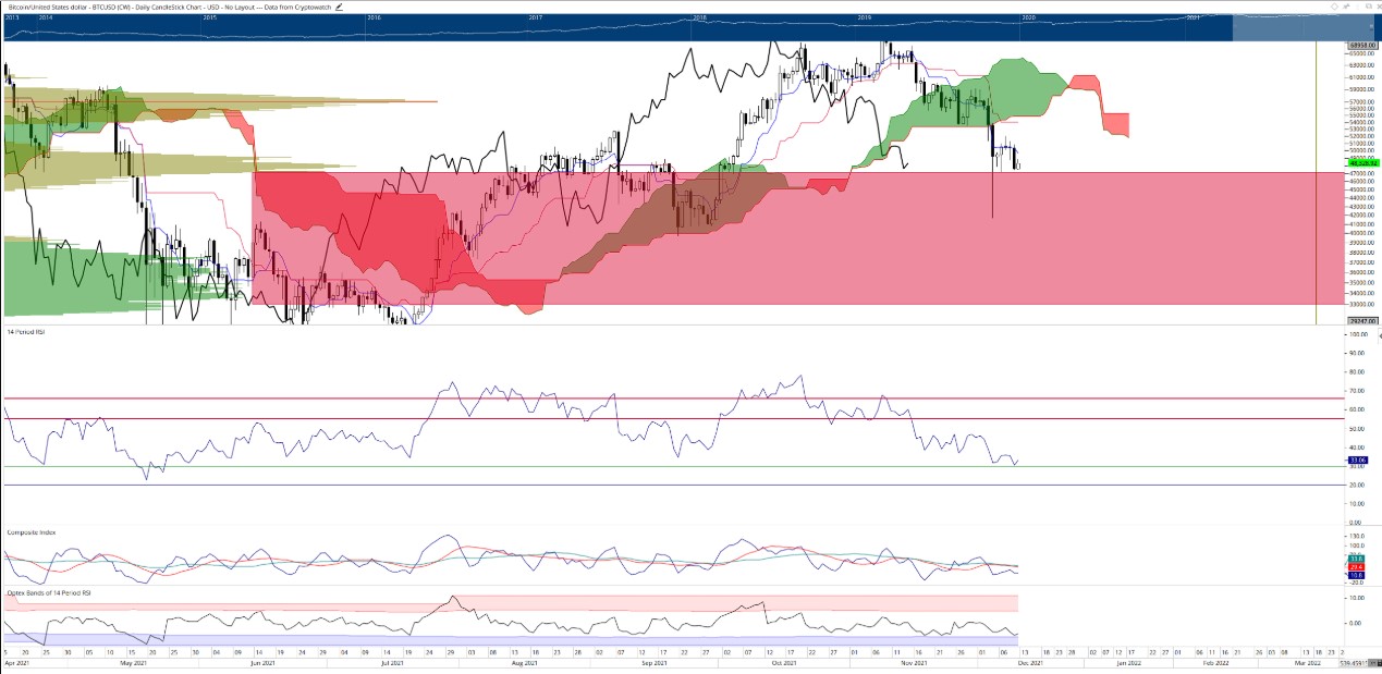 BTC price is indecisive as we head into the weekend. The 7-day chart indicates that bearishness might have been avoided. But the 0.5 Fib. retracement levels at $48K are showing signs of short-term support. This support level is confirmed on the oscillator signals.