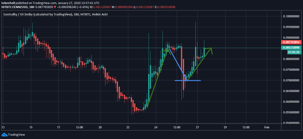The 5-days chart data of the Centrality (CENNZ) coin revealed that price value is increased by 30%. On Jan.22, the tag of value was clinging at $0.06 which then touched the crux of $0.097 on Jan.26. Currently, the price is making its position at $0.087.