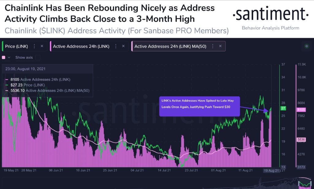 One reason for the Chainlink price surge is the rising number of address activities on its blockchain. Data from a top on-chain data analytics platform shows that LINK is now at a 3-month peak price. Despite its current impressive run, LINK is still 22% short of its peak price of about $54, which it attained three months ago.