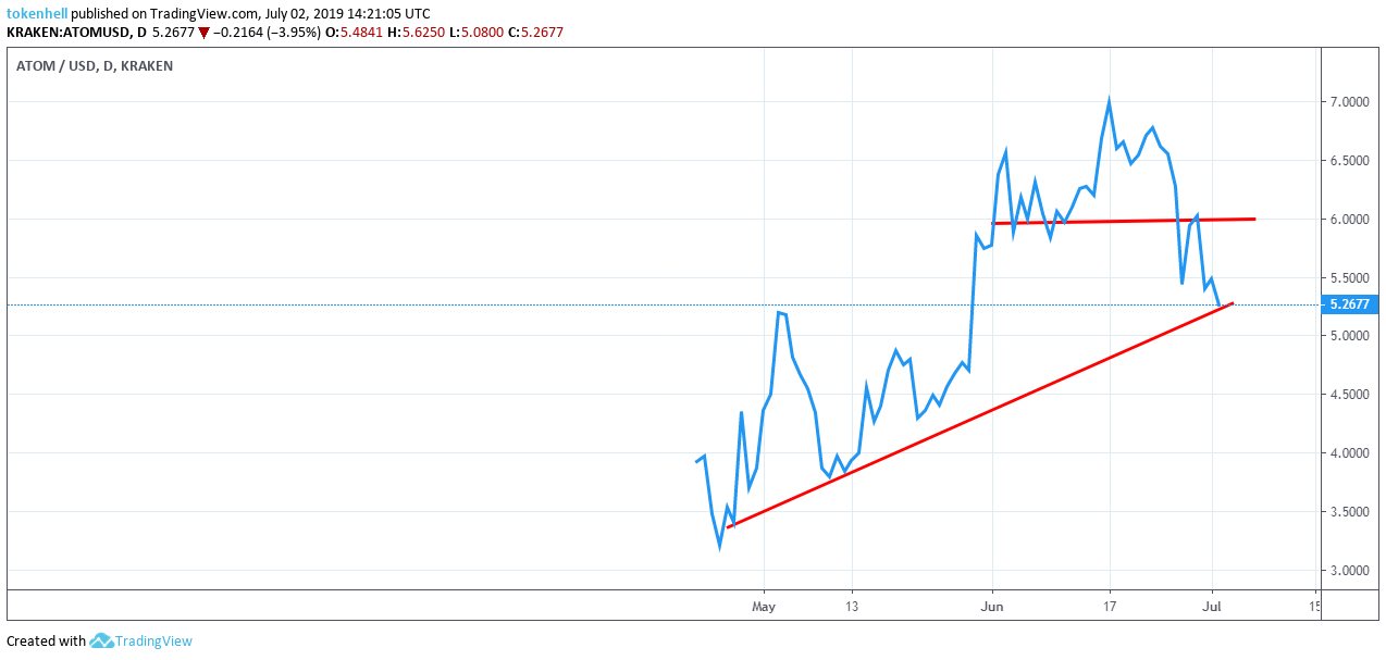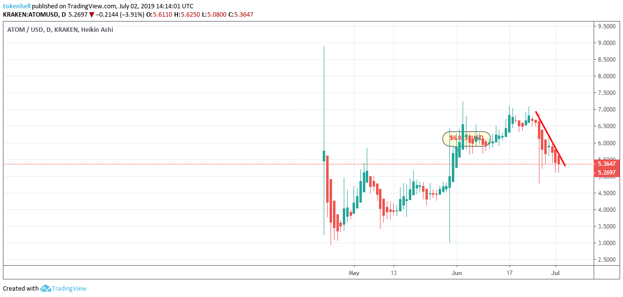 The price of Cosmos falls drastically in a month by a parabolic movement from 2 June to July 2.If we compare the price value of Cosmos coin of month, we come to know about that the price value on 2 June was $6.0237 USD which crash gradually to $5.3647 USD. After the alongside motion of coin, it then moved in downtrend at postion$6.1219 USD. The first resistance level was at $5.7219 USD, second resistance at $5.4122 USD. Today, it also fails to break the resistance level of $5.6250 USD.