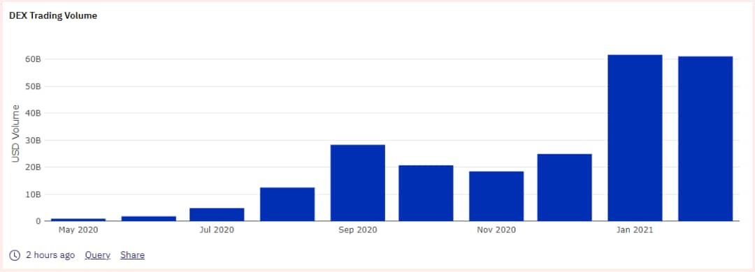 Thus far, the total trading volume for this year is well over $123 billion. According to dune analytics, this volume is higher than all the ones ever processed. Who is dominating the market? Sushiswap and Uniswap account for 65% of this volume, making them account for the trading volume’s largest share.