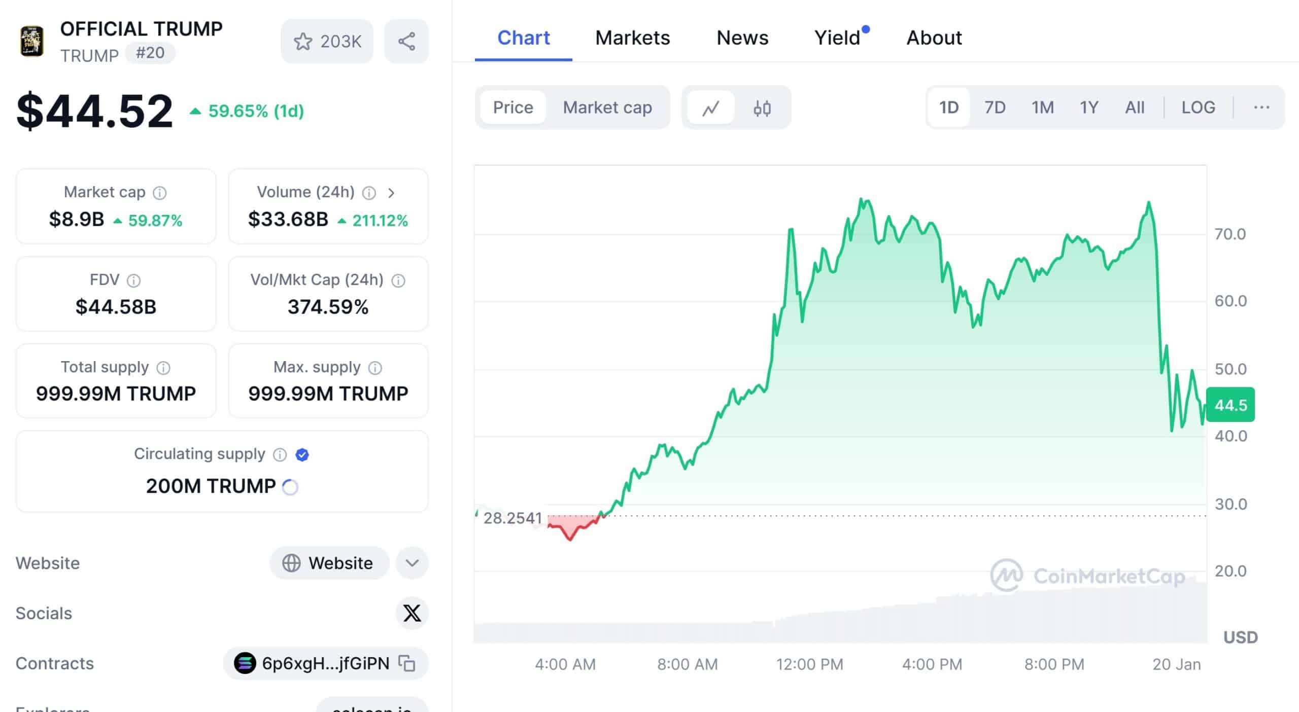 On Friday, President-elect Donald Trump introduced a new cryptocurrency called $TRUMP, a meme coin that quickly surged in popularity. By Sunday, the token’s market capitalization climbed to approximately $9 billion, having previously peaked at over $15 billion earlier that day. This venture adds to Trump’s portfolio of initiatives as he prepares for his upcoming inauguration.