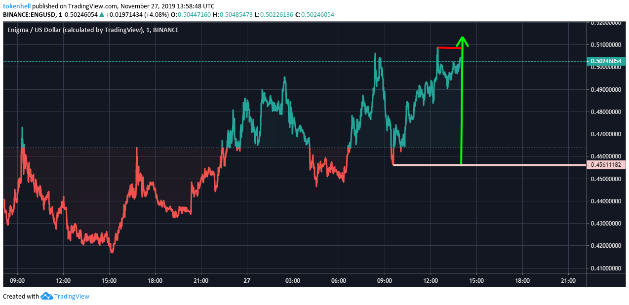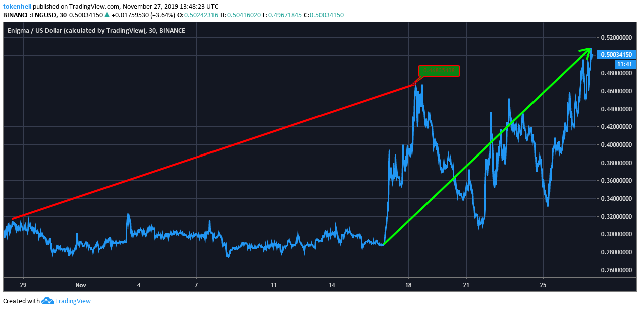 According to the last one-month price comparison of Enigma, the trend line of the coin has moved in the upward direction making its way into the bullish zone. The price of the coin has been ranging between $0.27 and $0.30 for a period of 18 days. The value of the token was trading at $0.28 on 16th Nov 2019. But from this point onward, the coin has flowed in the upward direction and has reached the point of $0.50 on 27th Nov 2019. The value of the coin has moved up by +70.91% within the duration of the last 11 days.