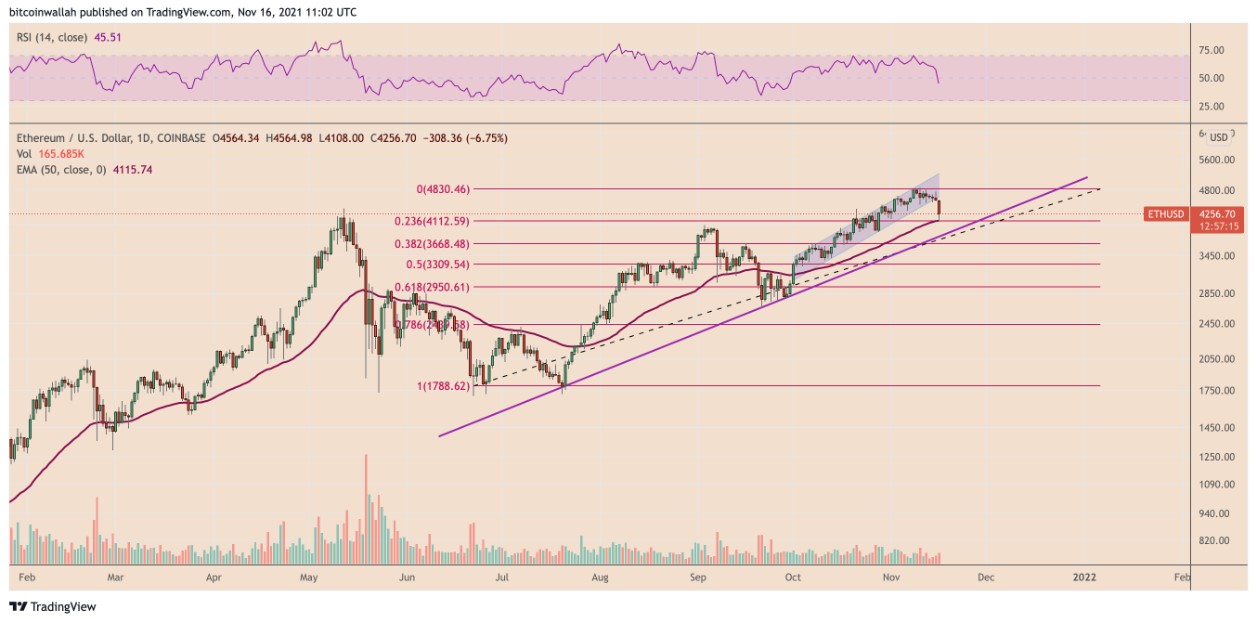 Rising wedge pattern on ETH/USD 24-hour price chart. Source: TradingView