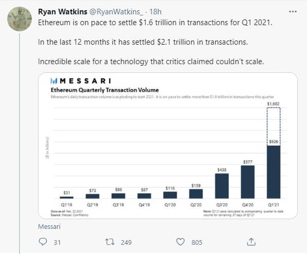 According to him, the value of transactions documented in the last quarter of the past year is far less than that settled in this year’s first quarter. He further forecasts that Ethereum’s quarterly settlement value might hit $1.6 trillion this year.
