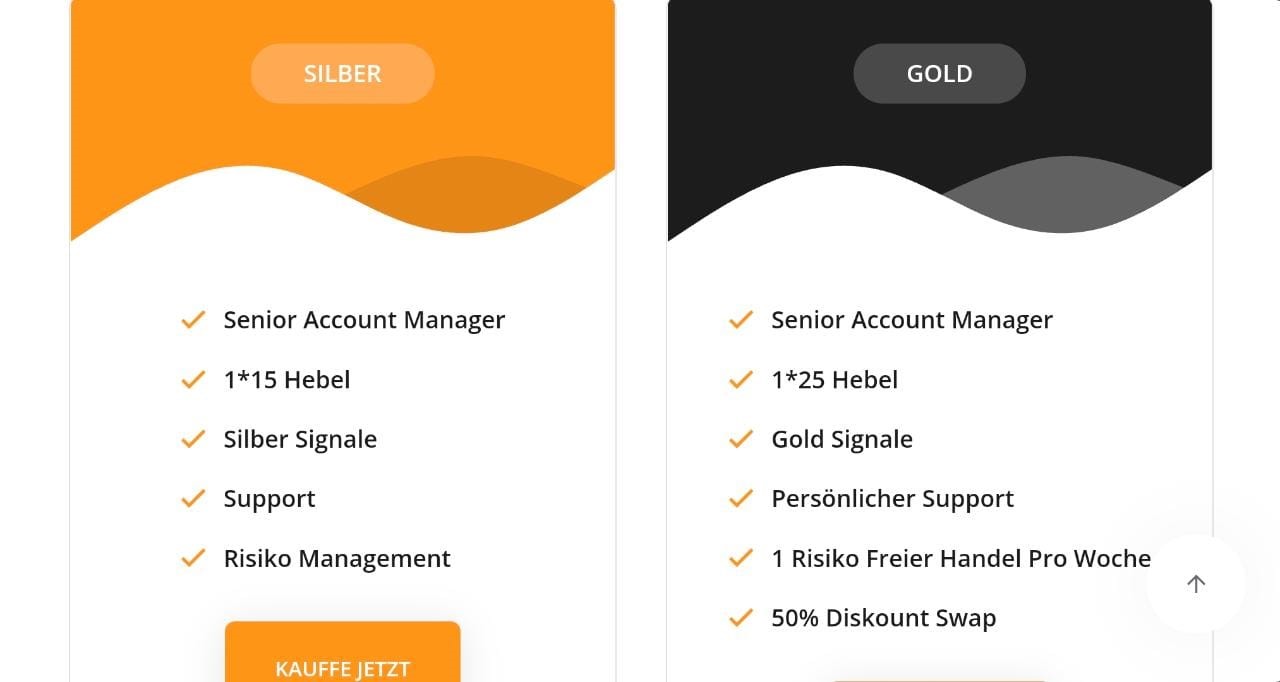 Gold: Einer der angebotenen Kontotypen ist das Gold-Konto. Mit diesem Kontotyp erhalten Sie einen Senior Account Manager, 1*25 Hebel, Goldsignale, persönlichen Support, einen risikofreien Handel pro Woche und einen 50% Rabatt-Swap. Das macht ihn zu einer guten Wahl für diejenigen, die eine umfassende Anlagelösung suchen. Wenn Sie also auf der Suche nach einer Plattform sind, die Ihnen viel bieten kann, sollten Sie sich GigaChians ansehen.