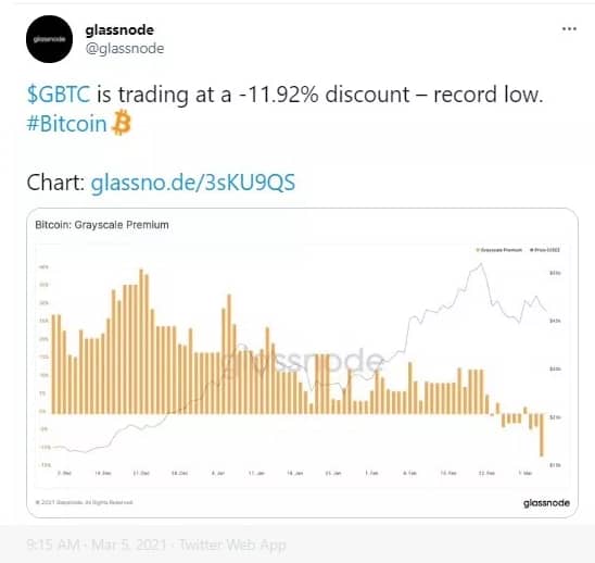 In his march outlook report, Mike McGlone (one of Bloomberg intelligence experts) states that the negative drop in grayscale premium could mean that the sell-off of Bitcoin from the past week could set up the market for a new run. Yesterday’s indicators show a possibility in the rise of BTC prices to the $50K range.