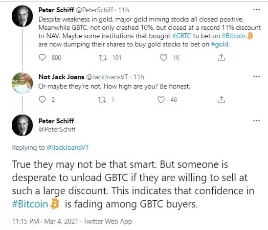 Glassnode’s tweet was a chance Peter Schiff couldn’t resist taking a swipe at Bitcoin. The CEO of Euro Pacific Capital made a serious of tweets, part of which was, “someone is selling his GBTC fast and might even be desperate to sell when they can be offered an enormous discount.”