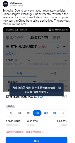 Celebrated Chinese crypto journalist, Collins Wu disclosed on Twitter that the top trading platform reduced its maximum possible trading leverage from 125x to less than 5x for current users. But China-based new users were forbidden from trading on derivates on the platform.