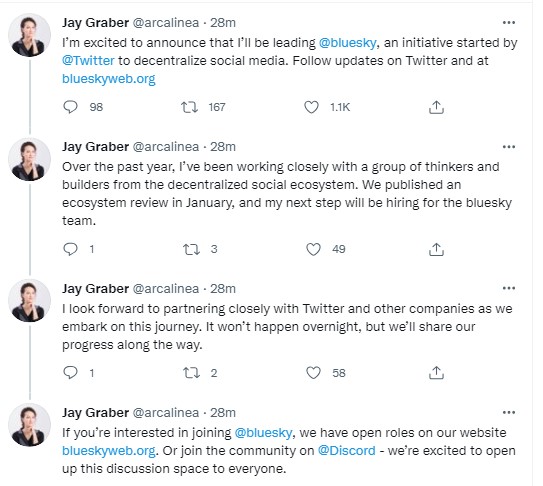 Jack Dorsey (Twitter founder) has announced Jay Graber as its new head of projects for Bluesky, a decentralized social media project founded by Dorsey. Graber tweeted his enthusiasm in working on the new project and his first major responsibility, which is recruiting a team for the project.