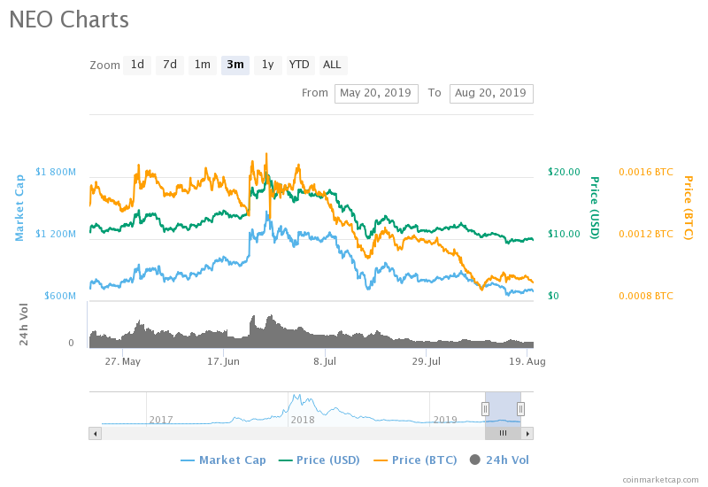 The 70,538,831 NEO tokens are circulating in the markets of cryptocurrency out of the total 100,000,000 NEO while the maximum supply of tokens is 100,000,000 NEO. The total market cap of the coin is $694,274,624 USD and 64,867 BTC. The 24-hours volume is holding the position at $242,487,196 USD and 22,656 BTC.