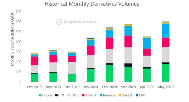 The crypto data firm CryptoCompare in its new report finds out that the crypto derivatives volumes on all cryptocurrency trading platforms are increasing more than ever. Crypto derivatives volumes touched an all-time high rising by 32% in May. After surging by 32% in a single month, derivatives volumes reached to $602 billion.