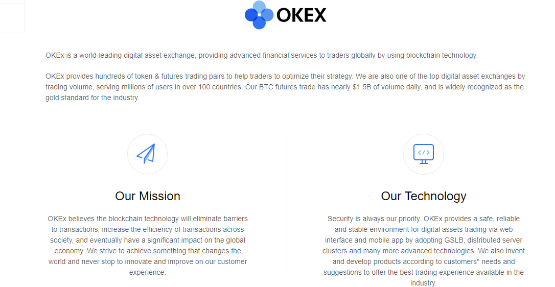 The daily volume of BTC futures trade on the Okex exchange is $1.5B. The crypto exchange is providing its services to users of more than 100 countries. The main mission of the exchange as described on the website is: