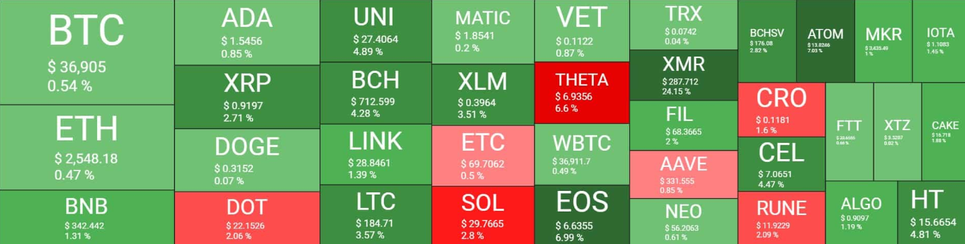 Most altcoins performed like their leader by also experiencing a slump within the last 24 hours. Ethereum dipped below $2,300, but it has recovered to now trade around $2,500. Binance coin also dipped a little above $300 but now trades around $350. Other large-cap altcoins performed in likewise manner, but most of them have become a little green over the last 24 hours. Some of those that turned slightly green and their percentage increment include LTC (3.5%), LINK (1.5%), BCH (4%), uni (5%), XRP (2.7%) and ADA (!%).