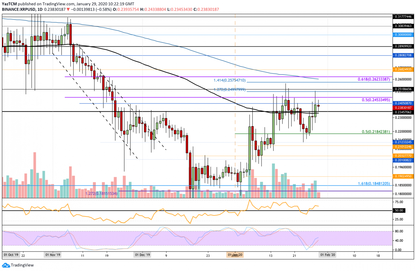 The value of XRP has lifted up from the trading point of $0.21 and has reached $0.24. XRP price reached even went above the 100-day EMA at $0.23 as touched the $0.25 mark. But from that, it slightly decreased down again to $0.23 mark.