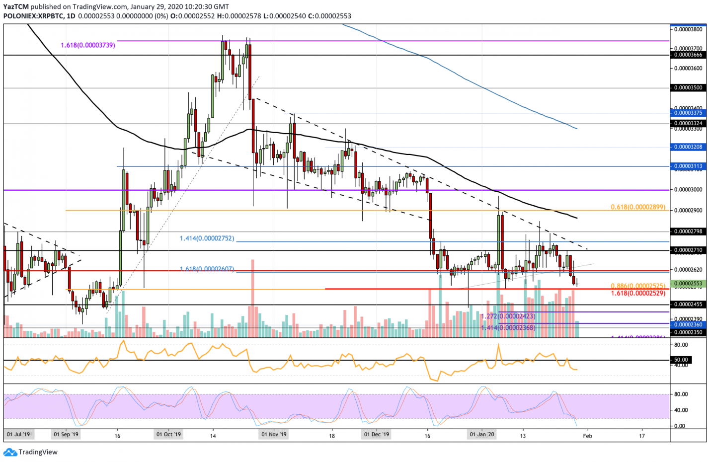 The technical signs show that further drop from this level could lead XRP to the five-month low even it could go beneath the trading point of 2400 SAT.