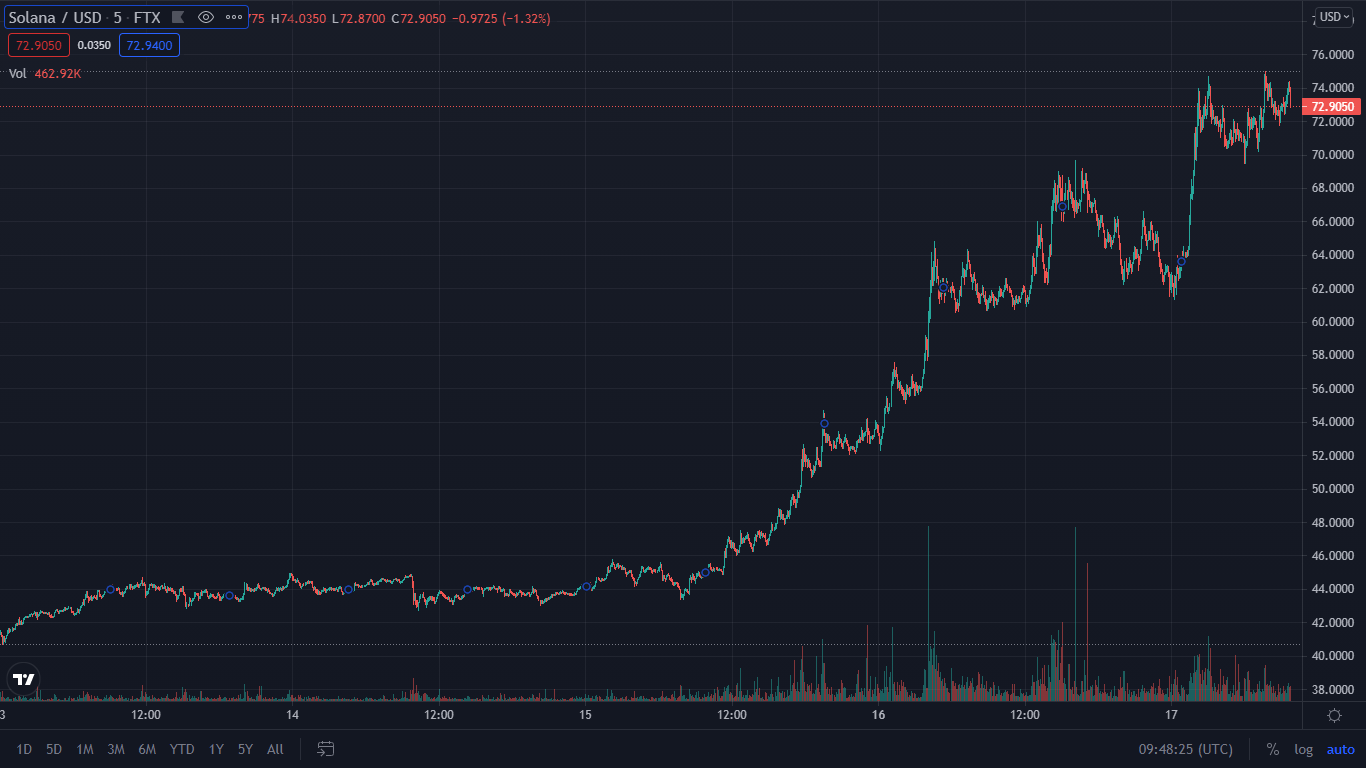While most coins have over the past few days slowed down their previously meteoric rises, Solana seems to have gone the opposite way. Over the past week, it has almost doubled in price making gains of about 90% culminating in it touching a new all-time high of $75 a few hours ago. As of the time of writing, the coin has undergone a slight drop and is trading at $72.70 which is expected after such a sudden surge in price. The coin has been undergoing a surge since the weekend making very strong gains and breaking into the top ten coins before tearing its way through to its new all-time high.
