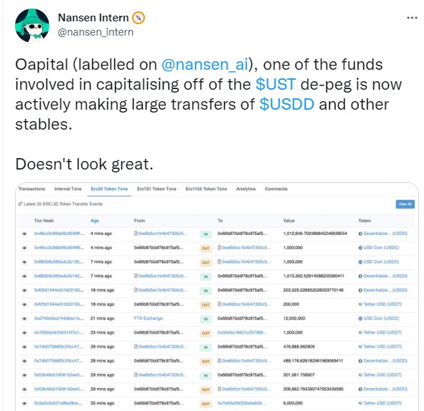 Recently, Nansen (a platform that tracks blockchain transactions) revealed that one of the funds that benefitted from the UST de-peg has been moving several volumes of USDD and other stablecoins.