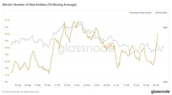 The latest data from the on-chain analytics platform, Glassnode, revealed that the number of new BTC entities within the past week was about 112,600, hinting at a possible BTC price rise in the next few days.