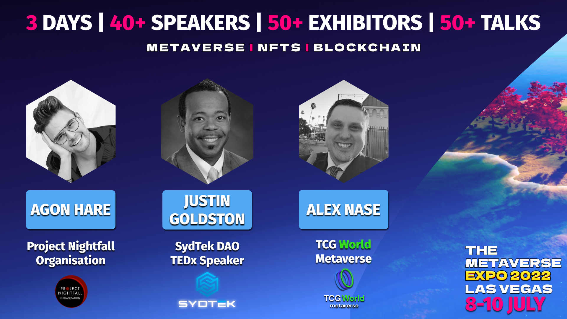 Showcasing a wide range of exhibitors, The Metaverse Expo 2022 features a host of key speakers & panelists including motivational speaker Agon Hare, from Project Nightfall Organization and Academia Professor & TEDx speaker Justin Goldston, PHD.