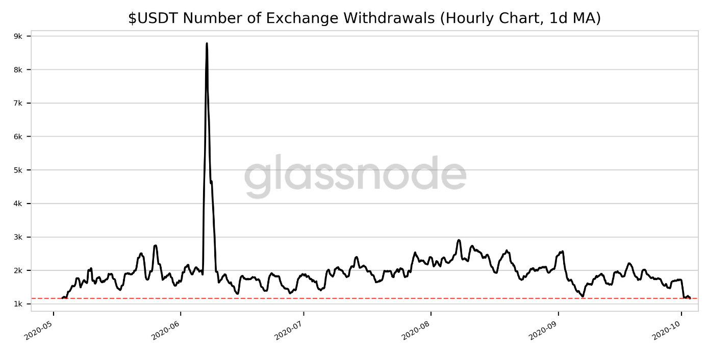 This is the new 5-month low for the Tether stablecoin in terms of exchange withdrawals. The previous five-month low for USDT was 1,164.208 which was noted on the 4th of May in 2020 by Glassnode.