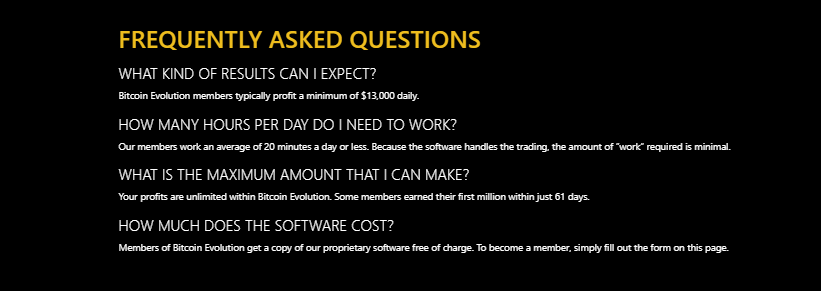 Like other crypto trading platforms, The Bitcoin Evolution also provides customer support for the sake of the customers’ help. On its official website, there is a section of FAQs where you can get anything that you want to know. Followings are some of the frequently asked questions given on the website: