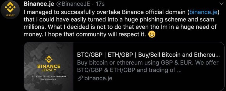 I managed to successfully overtake Binance official domain (binance.je) that I could have easily turned into a huge phishing scheme and scam millions. What I decided is not to do that even tho Im in a huge need of money. I hope that the community will respect it.