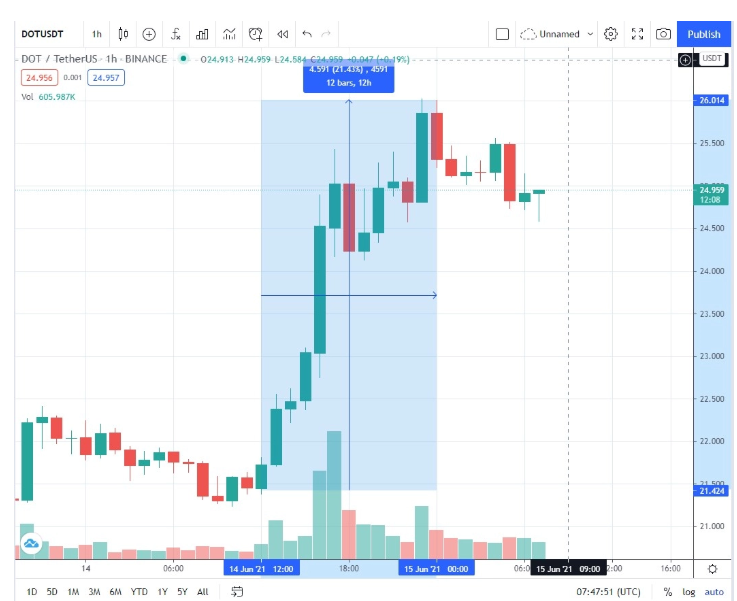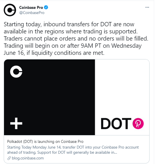One other possible reason for the continued price increase of the dot is that it is now listed on Coinbase Pro (a US-based crypto exchange firm). While DOT deposits can be performed from today, trading will start at about 9 am PT time on June 16, 2021.