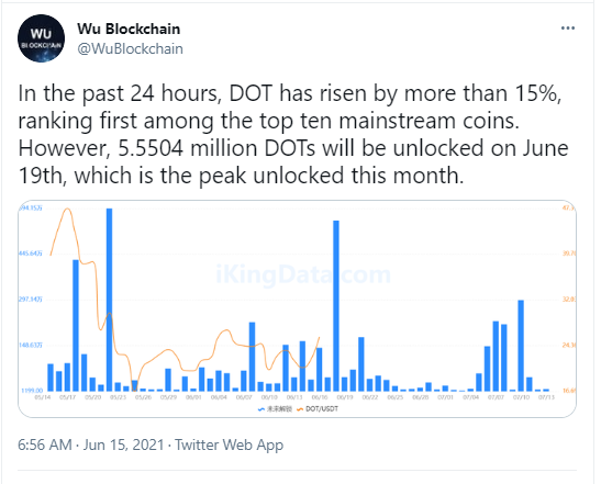 Esteemed blockchain and crypto journalist, Collins Wu, with the Twitter handle Wu blockchain confirmed that the DOT team would release approximately 5.6 million DOT on June 19.